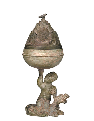 铜力士骑兽博山炉,炉盖雕镂成山峦形,人物、禽兽饰于其上,伫立峰顶的朱雀极富生机。 北京故宫博物院藏