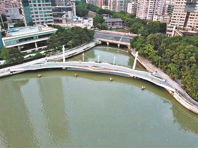 海珠涌人行桥昨日开放,成为贯通江岸景色的“点睛之笔”。