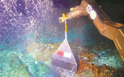 ● “海马”号深海遥控潜水器机械手放置十五运会和残特奥会“源火”采集点定位标识物。