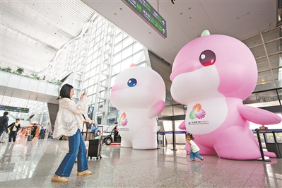 离十五运会开幕越来越近,近日,记者在白云国际机场看到,T1、T2两座航站楼内,全运氛围浓厚。“喜洋洋”“乐融融”随处可见,吸引过往旅客纷纷驻足拍照合影。广州日报全媒体记者李波、董业衡 摄影报道
