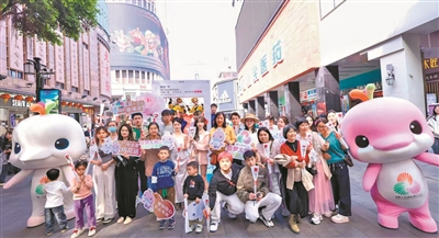 市民在繁华商圈与“喜洋洋”“乐融融”合影,享受全运热力。