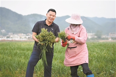 广州派驻梅州蕉岭新铺镇驻镇帮镇扶村工作队队长温凌麟(左)正协助农户收割蔬菜。