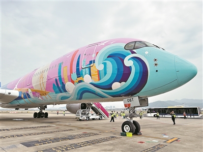 “我们耗时17天,使用近50种颜色,借助2D转3D制图工艺,融合港珠澳大桥、十五运会和残特奥会吉祥物‘喜洋洋’‘乐融融’等标志性元素给这架空客A350客机更换了涂装。”10月30日,在深圳机场,南方航空的深圳基地维修工程师刘宇钦指着旁边的“活力湾区号”告诉记者。