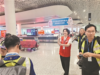 薛静是一名机场志愿者。她说:“像我这样的志愿者还有300多名,都是由我们深圳机场的员工组成的。我的工作职责就是和赛会志愿者一起通过接力的方式,为涉赛人员提供从飞机舱门到车门的接机引导服务。”据其介绍,为了保证接机工作顺利进行,机场按照一人一航班原则,安排志愿者精准对接涉赛航班,从涉赛人员出机舱开始,就一路引导至专用行李转盘提取行李,再由绿色通道出站到达抵离服务柜台,然后就交由赛会志愿者接力引导到专车处前往酒店。