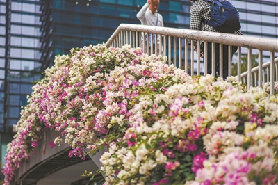 广州四季花开,有“花城”之称,图为越秀区东风路天桥,粉白双色的簕杜鹃盛开。广州日报全媒体记者吴子良摄