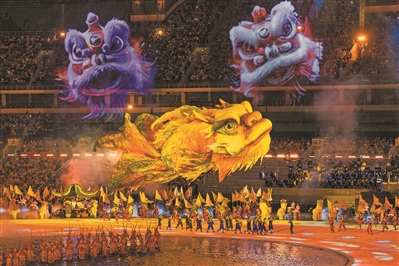 开幕式上的全息投影“醒狮”与漂浮道具“鳌鱼”交相辉映。广州日报全媒体记者苏俊杰 摄