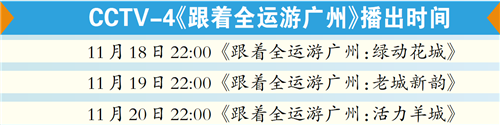 广州日报讯 (全媒体记者莫斯其格)办好一个会,提升一座城,彰显一座城,幸福一座城。首次由粤港澳三地联合承办的第十五届全国运动会自开幕以来,如同一扇窗,映照出一个活力满满的广州。以“十五运会”为契机,广州着力推动“体育+”深度融合,促进体育与文化相融、与科技互动、与旅游联动、与城市共生,把全运会带来的流量转化为广州发展的能量。11月18日~20日,三集系列片《跟着全运游广州》在CCTV-4播出,带观众打卡羊城,看看这座城市到底有多拼。