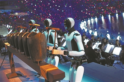 十五运会开幕式上,机器人双手持锤,敲击青铜句鑃,奏响岭南名曲《彩云追月》。新华社发