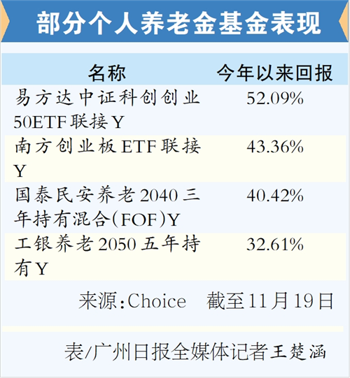 11月19日,记者在国家社会保险公共服务平台查询发现,目前共有305只个人养老金基金。值得关注的是,受益于权益市场向好等因素,Choice数据显示,截至11月19日,今年以来超九成个人养老金基金取得了正收益,81只个人养老金基金的收益超20%,易方达中证科创创业50ETF联接Y、天弘中证科创创业50ETF联接Y等多只基金收益高达50%以上。