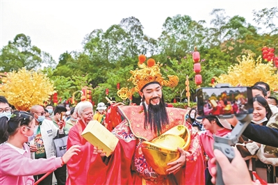 现场游客可领取一份寓意美好的“五福宝册”,随五福星一同游园。福星送“福”,禄星赠“禄”,寿星贺“寿”,喜神传“喜”,财神招“财”。游客可在与五福星的趣味互动中收集特色印章,沿路还可打卡寓意“福禄双全”的见龙景点、象征“和和美美”的和美水景、寄托“好运绵长”的七星桥等众多福文化主题打卡点。成功集齐印章的游客,可在山顶广场兑换观音山准备的专属新年福礼。