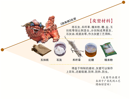 灰塑,俗称“灰批”,是岭南建筑的传统装饰工艺,与岭南传统建筑“三雕”齐名。灰塑造型生动、色彩艳丽,从材料选择、制作技艺到题材内容都有着鲜明的岭南特色。此外,以石灰为主要材料的灰塑还具有防热、防雨、防潮等优点,尤其适合岭南的湿热气候条件。2008年,灰塑被列入国家级非物质文化遗产代表性项目名录。