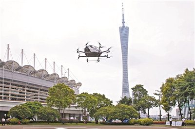 亿航EH216-S准备在海心沙降落。 广州日报全媒体记者苏俊杰 摄
