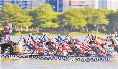 龙舟健儿在水面飞驰竞渡,赛龙夺锦。