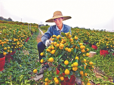 在有记桔场,“有哥”正专注于年桔造型,他坐在一株年桔盆栽前,手里拿着一把剪刀,地面摆着一捆细铁丝,双手熟练地在枝叶间“穿梭”,这里修剪几下,那里用铁丝缠绕固定,将隐藏在枝叶下的桔子显露出来,不多时,经他一番修整,一盆原本杂乱的年桔便初现优美的造型。“今年要出售的年桔有4000多盆,已全部预订了。”有记桔场老板笑着说。