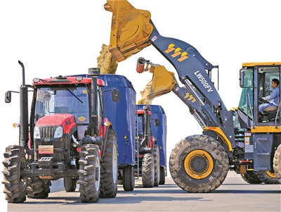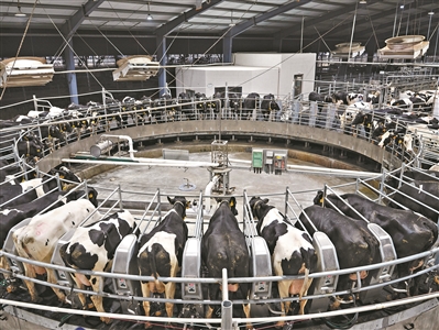 奶牛进入转盘式挤奶机,依次完成自动化挤奶。