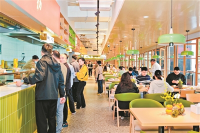透过开放式厨房,大厨制作的菜肴香气扑鼻。“全部都是现炒现做,没有预制菜。”服务员补充道。为了保证出餐效率和品控,厨房里还有“黑科技”炒菜机器人帮忙烹饪。在附近上班的林先生约同事来这里,吃完饭还能顺便买杯咖啡溜达一下,节奏刚刚好。这种“刚刚好”的体验,源于食堂多功能布局。总建面约639平方米的空间里,不仅有能同时容纳130人就餐的区域,还整合了超市、图书室、咖啡馆、宠物店和暖心驿站等功能区。