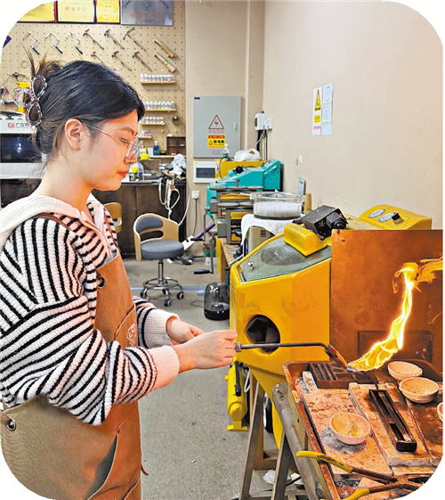 水贝一家正规店铺的员工在得到顾客确认后进行熔金操作。