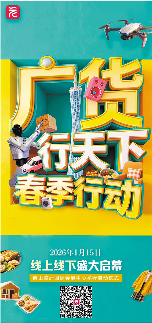 从“珠江水、广东粮、岭南衣、粤家电”的烟火年代,到无人机、新能源汽车、5G手机等新质生产力集群领跑全球,“广货”早已超越地域符号,成为中国制造向“中国智造”跃升的核心载体。1月15日,广东将在佛山正式启动“广货行天下”春季行动发布会暨家电专场促销活动,以家电产业为先锋,联动多品类好物开启全年拓市新篇章,为全省“十五五”时期发展开好局、起好步注入强劲动能。据不完全统计,“广货行天下”春季行动,将举办近30场重点活动,超10家大型商业平台和大批线下商超支持,约6000家企业参与。