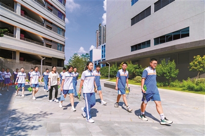 广东仲元中学莲花湾学校去年9月启用,同学们在校园里运动。