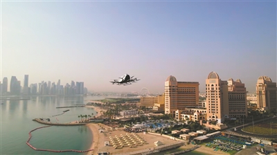 EH216-S无人驾驶载人航空器在多哈港与卡塔拉之间飞行。