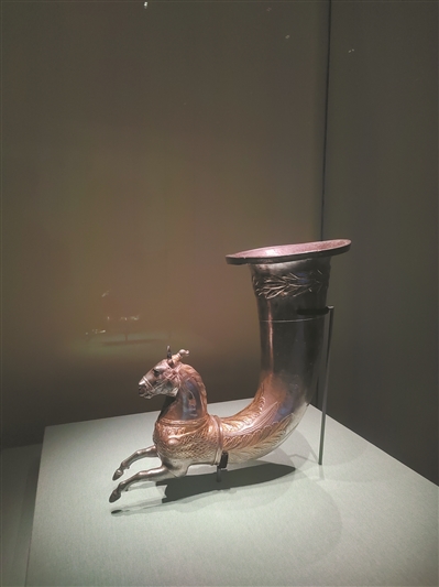 在广东省博物馆正在展出的“科威特王室珍藏展”里,有一件银质的马身来通杯。杯是经典的号角形,马身前探,双足腾跃,胸前装饰有赫拉克勒斯结,肩膀饰扇形鳞片图案,象征女神雅典娜“圣盾”的神圣保护。