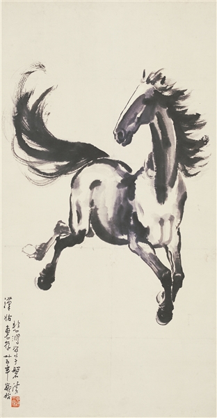 徐悲鸿是马题材画作的代表性大家,他的《饮马图》与《奔马图》(上)动静相宜。