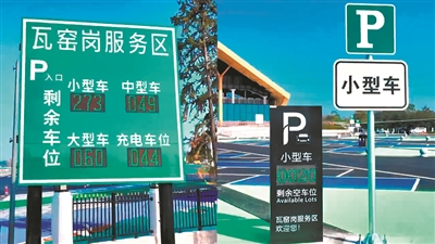 在瓦窑岗服务区入口处,分级车位诱导屏清晰显示服务区全部车位使用情况。