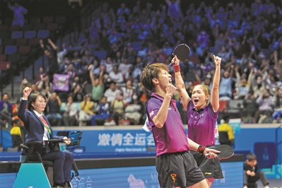 林高远、刘诗雯庆祝十五运会乒乓球成年组混双夺冠。