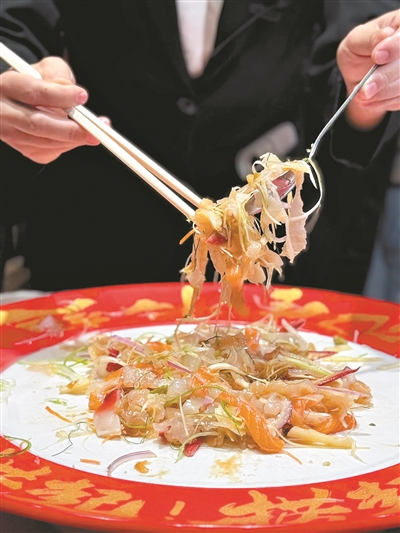 新春之际,由行政总厨黄尚烽精心打造贺年菜单,融传统技艺与现代创意于一体。招牌捞起螺片帝王鲑,薄切螺片与帝王鲑搭配秘制酱汁,脆嫩与绵密交织,呼应“风生水起”年俗,鲜醇回甘;鸡油海胆汁蒸龙虾配陈村粉,鸡油海胆汁浸润鲜嫩龙虾,酱汁搭配柔韧陈村粉,米香与海味交融,尽显高端粤味匠心,这些佳肴各有风味,藏着新春美好期许。 (文/广州日报全媒体记者曾繁莹)