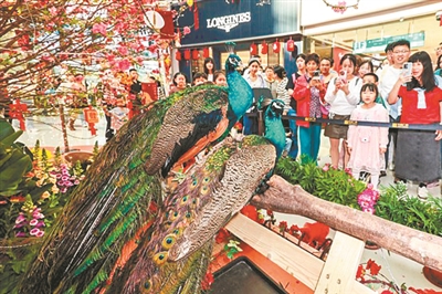 春节期间,正佳广场内新添多处新春限定特色打卡点,游客们像开盲盒一样,一步步开启惊喜之旅:每日下午3时至5时,骆驼与巨型机械熊猫与游客亲密互动;同一时段,一楼中庭里,孔雀优雅驻场,游客偶遇开屏,更寓意“开屏见喜,好运当头”。步入二楼正佳极地海洋世界,灵动海马悠然游弋,马年见“海马”,沾福转运。移步六楼正佳自然科学博物馆,取自总长约40米的远古巨木段体的11件印尼珍贵硅化木化石,向观众讲述远古巨木的传奇。七楼正佳企鹅冰雪世界内,驯鹿踏雪而至,为南方游客带来北国童话般的冬日浪漫……这些散落于各楼层的互动打卡点,让人们步步有奇遇,在赏灯逛会的每一个转角都充满了期待。
