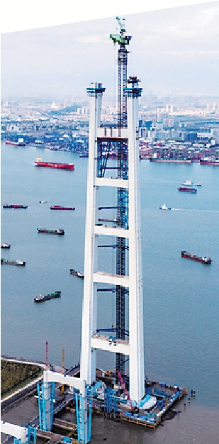 塔柱和横梁钢壳节段完成制造后,将整体运输至桥址,再利用全球最大移动平衡重塔式起重机,吊装至高空进行毫米级精准对接。