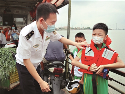 “请同学们上船后找到安全位置站好扶稳,不要在船上嬉戏打闹。”昨日6时30分左右,学生们陆续登船返校,海事人员在渡口现场和渡运水域协助学生有序上下渡船。同时,海巡船也在渡船航经水域实时盯守,直至学生们全部安全渡运返校。