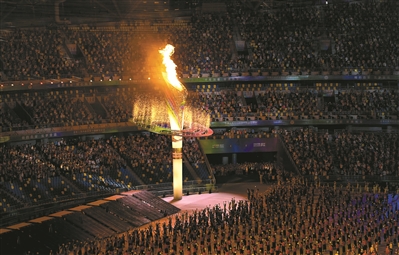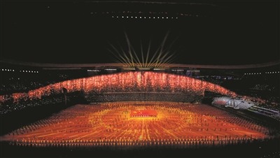 圣火映衬下,开幕式在主题歌《跨越》中渐近尾声。夜幕下的西安奥体中心体育场,像一朵石榴花一样,绽放在灞河之滨。