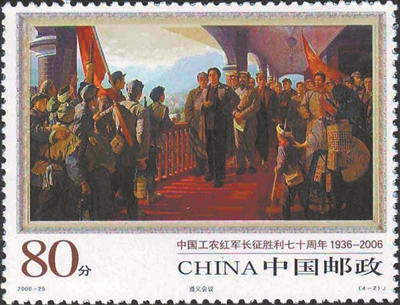 第2枚邮票“遵义会议”,真实再现了遵义会议胜利召开后的场景。1935年1月15日至17日,党中央在遵义城召开政治局扩大会议(即遵义会议),会议集中全力纠正了博古等人在军事上和组织上的“左”倾错误,确立了毛泽东在党中央和红军的领导地位。