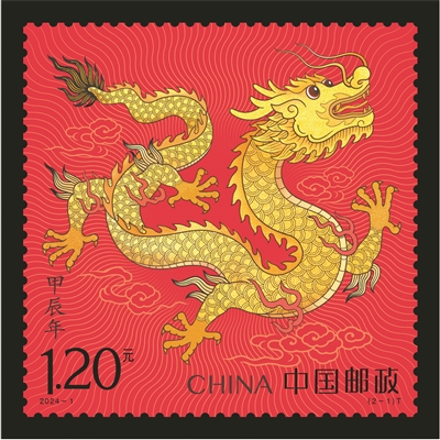 《甲辰年》特种邮票是中国生肖邮票第四轮中的第九套,由著名邮票设计家王虎鸣老师设计。邮票一套两枚,第一枚名为“天龙行健”,邮票上的五爪金龙形象源自九龙壁上的造型,龙首昂扬向上,矫健生动,脚踏云纹气浪,神采飞扬,表达了喜庆祥和、迎吉纳福的美好期望;第二枚名为“辰龙献瑞”,描绘了两条对称的平面装饰风格的金龙,取材于传统吉祥纹样“祥龙拱璧”,轮廓线条流畅优美,表达了对新的一年的真挚祝福。