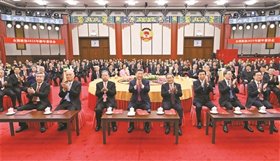 茶话会上,习近平等来到各界人士中间,同大家亲切握手,互致问候。全国政协委员和文艺工作者表演了精彩的节目。最后,全场起立高唱《团结就是力量》。会场内洋溢着欢乐祥和的节日气氛。