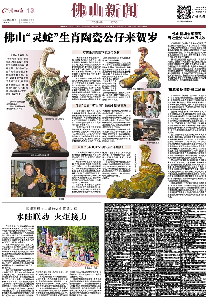 - 佛山“灵蛇”生肖陶瓷公仔来贺岁 乙巳蛇年将至,在“千年陶都”佛山,每到岁末,市民都有一项特别有仪式感的活动,就是选择一款“心水”的生肖陶瓷公仔装点家居或者馈赠亲友。近日,记者走访了几位陶艺大师工作室,发现极富寓意的生肖“蛇”已陆