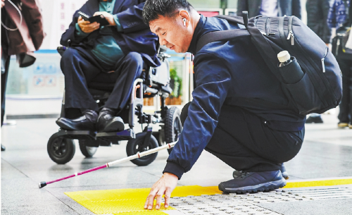 方坚泽也操作电动轮椅,对比体验了一下原来的盲道和这一条全新的导引线。他说:“如果轮椅的轮子不够大,碾过原来的盲道,会有不小的震动,这条新线紧贴地面,让人很有安全感。”