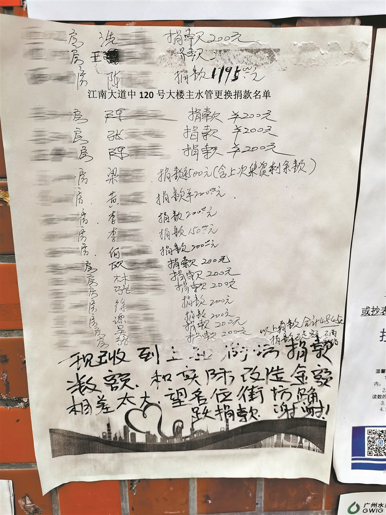也就是那一天,困扰当地住户至少一年多时间的水管失修问题,终于得到了解决。“我们原来是单位宿舍,后来单位对房屋的管理撤了出来,虽然还会象征性收一些物业费,但费用不多,都花在了日常小修小补上,比如更换楼梯灯泡、请清洁工定期打扫公共区域等,但老房子的公共问题,其实远远不止这些。”陈振炎告诉记者,“水管更换是我在2023年发起动议的,当时水管年久失修,而且大面积锈蚀、水压极低,所以我发动大家一起筹钱更换水管,一起随喜乐捐。”