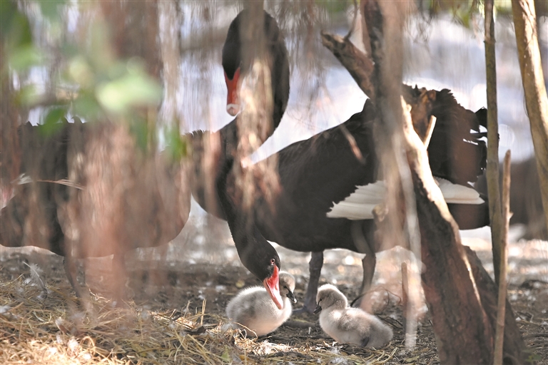 据了解,生活在深圳野生动物园里的黑天鹅,孵化期30天左右。一般情况下,出壳的小天鹅在巢里待一至两天后,其“父母”才会带着小鹅出巢活动。