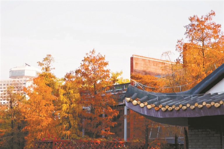 穿过可园广场一路向南便来到湖边,这里渐渐变红的落羽杉叶与周边葱郁树木互相衬托,高低掩映,编织成一幅幅红绿锦缎,令市民和游客流连忘返,大家纷纷拍照记录下落羽杉的惊艳时刻。