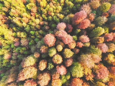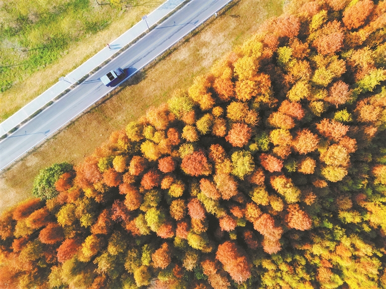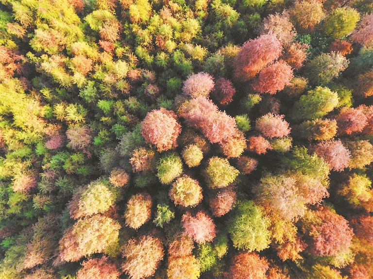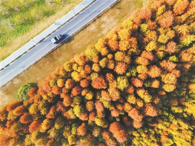 伴着冬日暖阳,在顺德乌洲水闸,成片的落羽杉正尽情生长。连日来,这片色彩各异的落羽杉在广佛火爆出圈,成为这个冬日里的“顶流美景”。从天空中俯瞰,落羽杉林像是一幅幅油彩画;若从大堤上远眺,落羽杉林则如一面面涂鸦墙。人们在这里搭起了帐篷,一辆辆载有咖啡机的车子排起了长龙,让人们一边品着咖啡,一边欣赏着这片冬日里的童话世界。