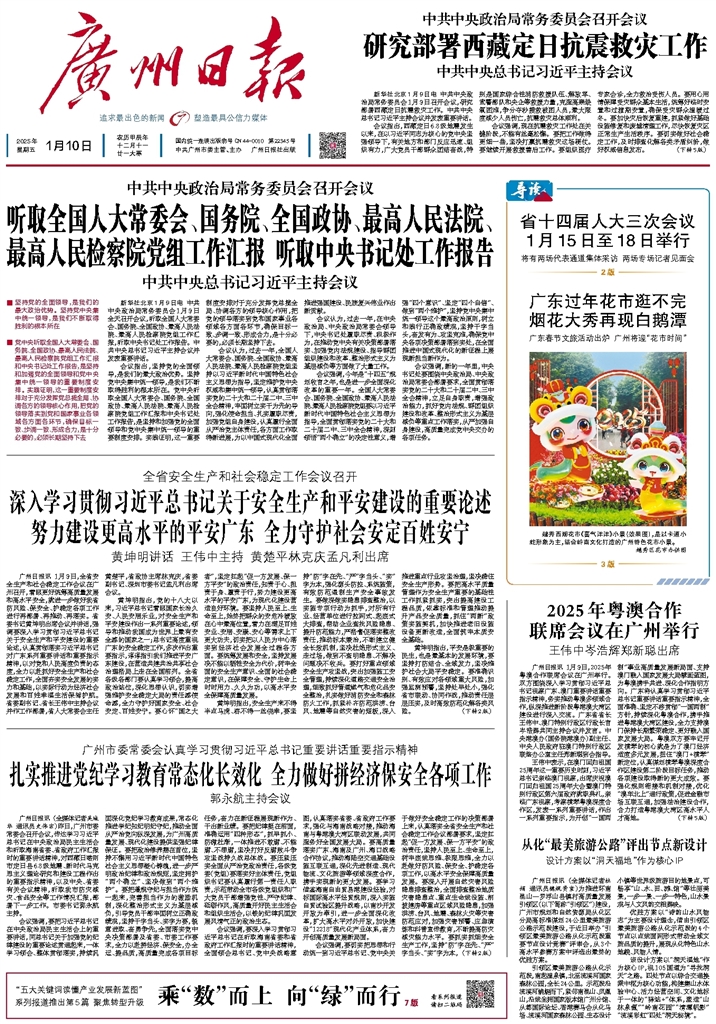 - 深入学习贯彻习近平总书记关于安全生产和平安建设的重要论述努力建设更高水平的平安广东 全力守护社会安定百姓安宁 广州日报讯 1月9日,全省安全生产和社会稳定工作会议在广州召开,着眼更好统筹高质量发展和高水平安全,就进一步做好我省防风险、保安全、护稳定各项工作进行再部署、再推动、再落实。省委书记黄坤明出席会议