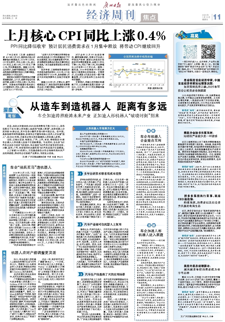 - 从造车到造机器人 距离有多远 深度观察 近日,远在大洋彼岸的2025全球消费电子展(CES)上,英伟达展出了由14款人形机器人组成的“机器人军团”,这些机器人分别来自14家企业,其中包含小鹏汽车等6家中国企业。在中国,