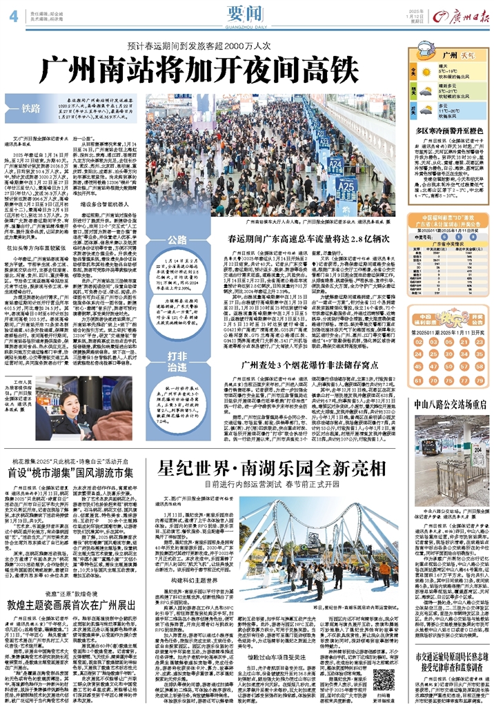- 广州南站将加开夜间高铁 文/广州日报全媒体记者黄庆 通讯员秦国威 2025年春运自1月14日开始,至2月22日结束,为期40天。广州南站预计到发旅客2016.8万人次,日均到发50.4万人次。其中,预计发送旅客1