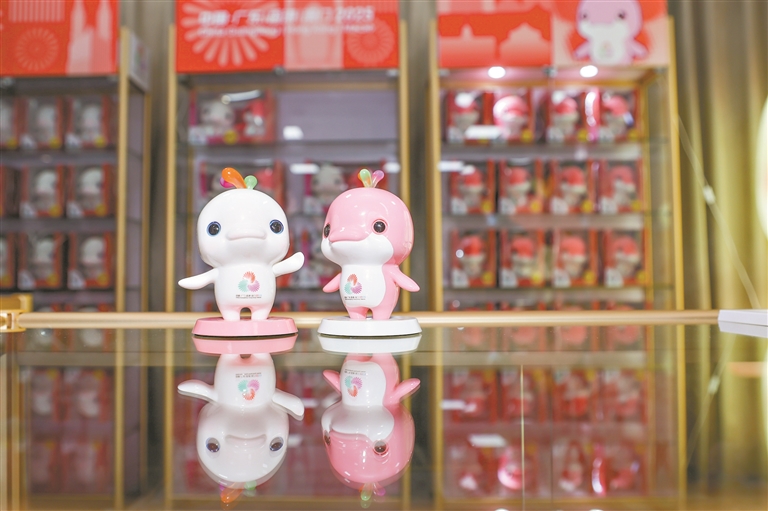 一白一粉的喜洋洋、乐融融毛绒玩具是现场备受关注的明星产品。“可能很多人不清楚中华白海豚为什么除了白色还有粉色,其实它们在运动的时候血管充血,皮肤就会泛出粉色,这也和运动员的运动状态相吻合,契合运动会主题。”刘平云解释道。