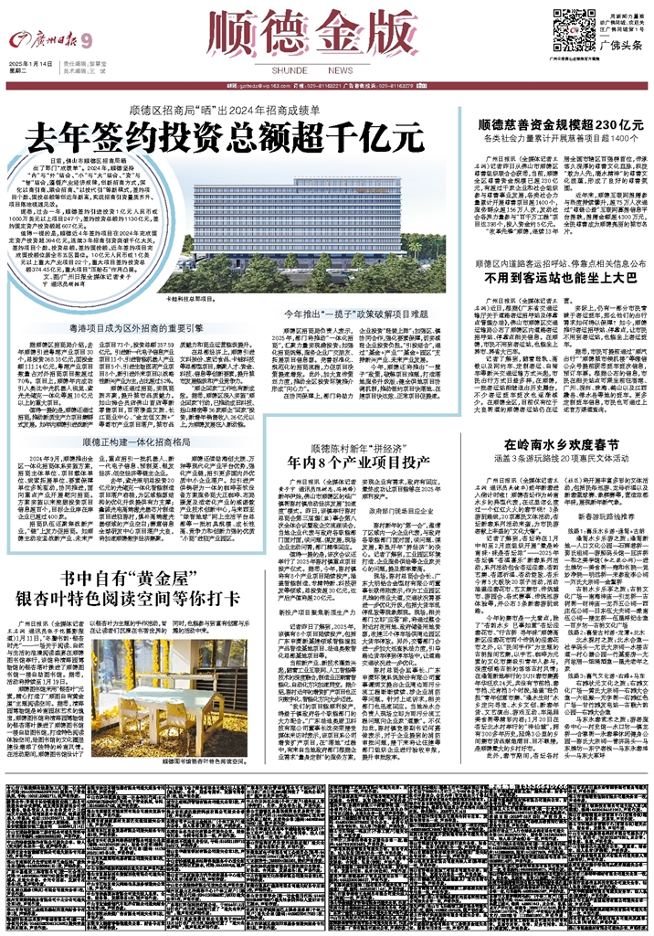 - 去年签约投资总额超千亿元 日前,佛山市顺德区招商局晒出了部门“成绩单”。2024年,顺德坚持“内”与“外”结合、“小”与“大”结合、“资”与“智”结合,遵循产业经济规律,创新招商方式,深化以商引商、联合招商、“以投代引”等