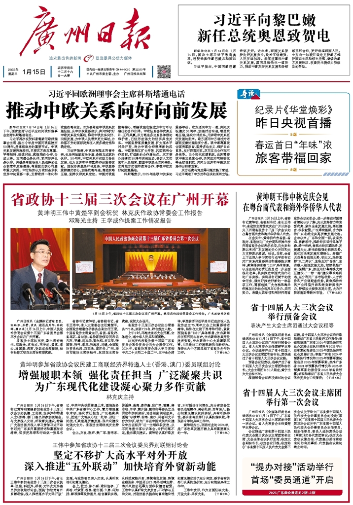 广州日报讯 (全媒体记者徐雯雯、张姝泓、苏赞、黄岚 通讯员周际、孙晓晖、赖亦宸)1月14日上午,中国人民政治协商会议第十三届广东省委员会第三次会议在广州开幕。