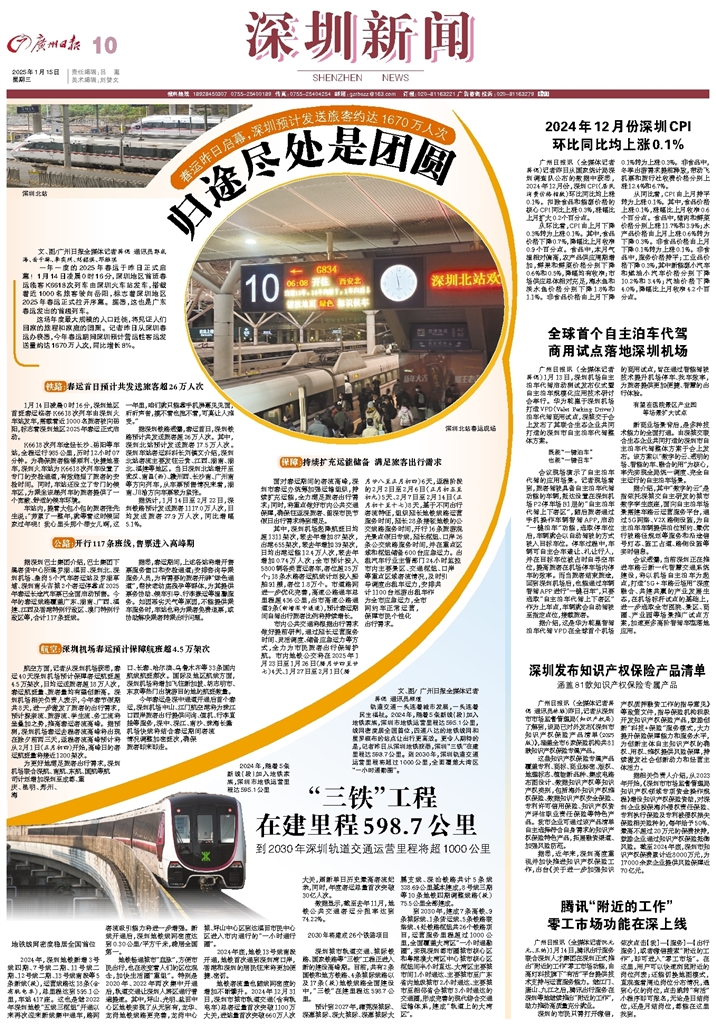 - “三铁”工程在建里程598.7公里 文、图/ 广州日报全媒体记者蒋偲 通讯员顾瑾 轨道交通一头连着城市发展,一头连着民生福祉。2024年,随着5条新线(段)加入地铁家族,深圳市地铁运营里程达595.1公里,线网密度居全国首位,四