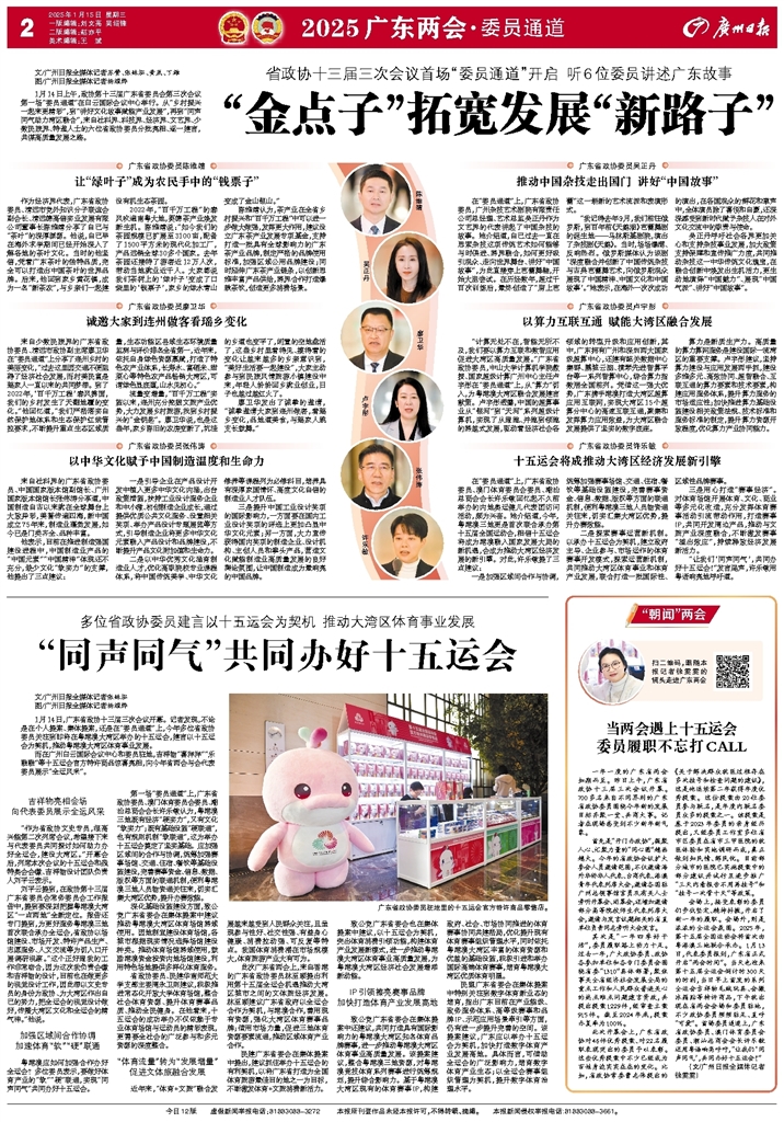 - “同声同气”共同办好十五运会 文/广州日报全媒体记者张姝泓 图/广州日报全媒体记者杨耀烨 1月14日,广东省政协十三届三次会议开幕。记者发现,不论是在个人提案、集体提案,还是在“委员通道”上,今年多位省政协委员关注到即